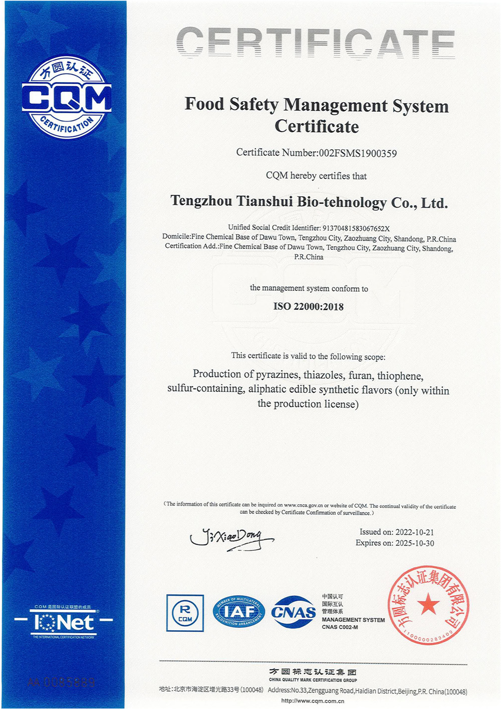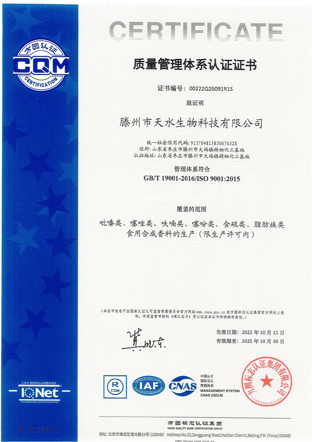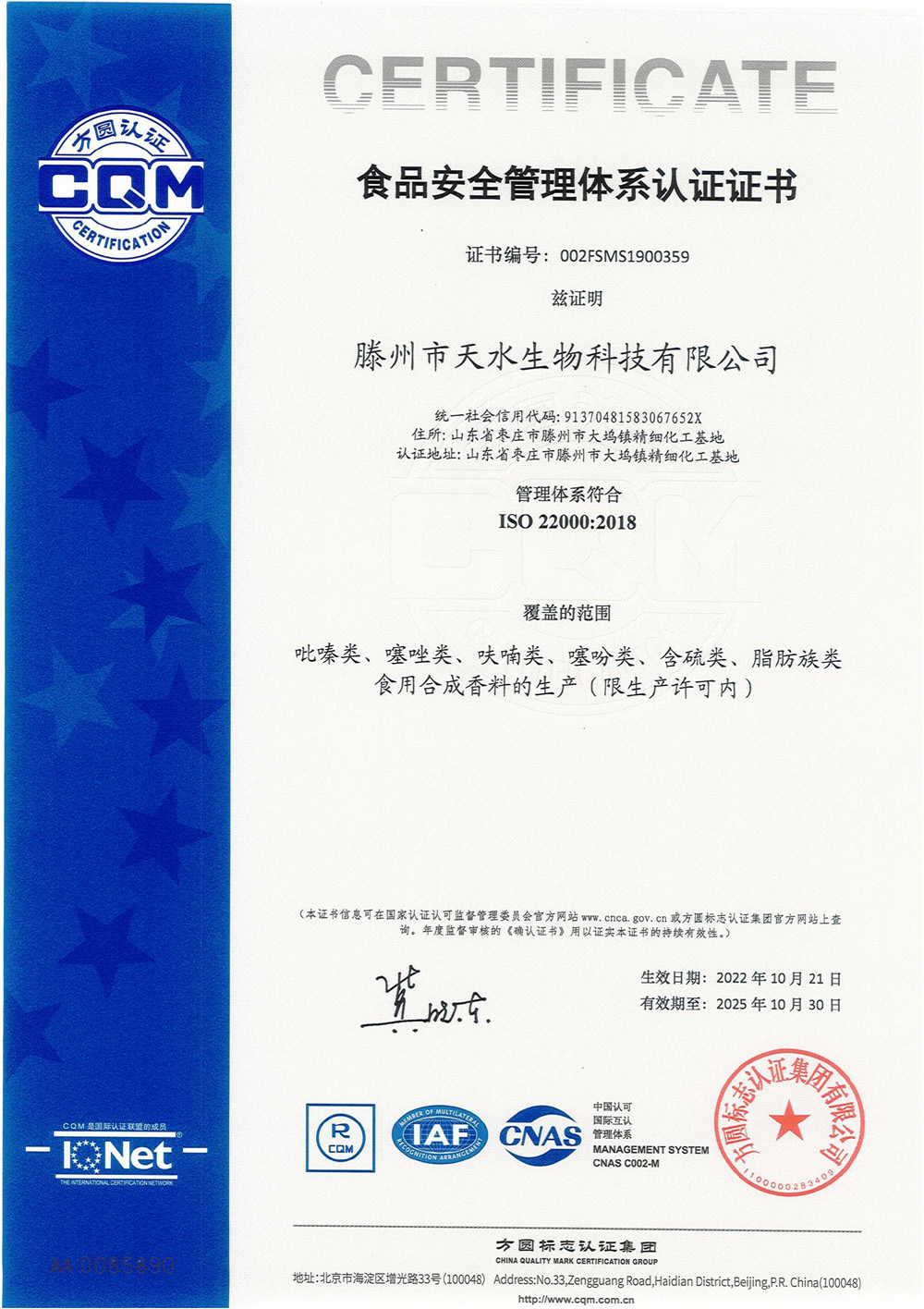 滕州市天水生物科技有限公司成立于2011年9月,是目前國內(nèi)雜環(huán)類合成食品香料、日化香料和醫(yī)藥中間體生產(chǎn)經(jīng)營的綜合性企業(yè)。坐落于山東省滕州市生物醫(yī)藥產(chǎn)業(yè)基地,總投資5000余萬元,占地面積約30000平方米,員工百余人。公司先后被評為高新技術(shù)企業(yè)、專精特新中小企業(yè)、科技型中小企業(yè),建有市級(jí)重點(diǎn)實(shí)驗(yàn)室1處,并先后獲得ISO9001質(zhì)量體系認(rèn)證、ISO22000食品安全體系認(rèn)證、kosher認(rèn)證和Halal認(rèn)證。是香精香料及食品配料協(xié)會(huì)會(huì)員單位及滕州市中小企業(yè)協(xié)會(huì)理事單位。