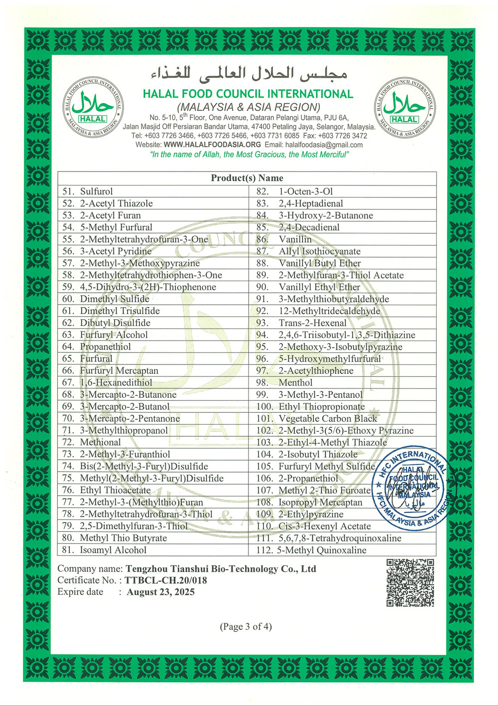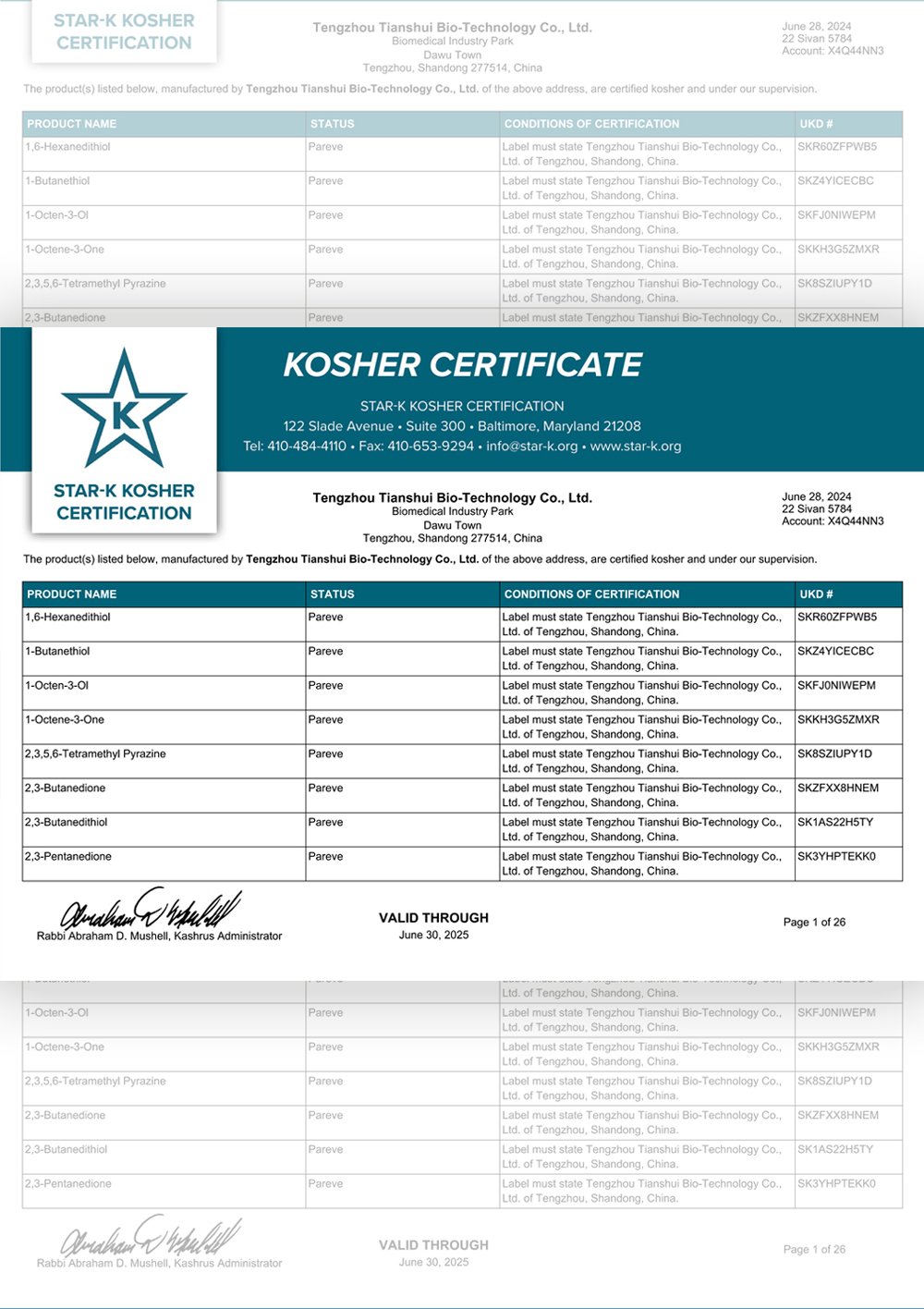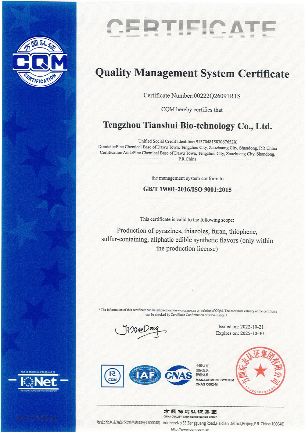 滕州市天水生物科技有限公司成立于2011年9月,是目前國內(nèi)雜環(huán)類合成食品香料、日化香料和醫(yī)藥中間體生產(chǎn)經(jīng)營的綜合性企業(yè)。坐落于山東省滕州市生物醫(yī)藥產(chǎn)業(yè)基地,總投資5000余萬元,占地面積約30000平方米,員工百余人。公司先后被評為高新技術(shù)企業(yè)、專精特新中小企業(yè)、科技型中小企業(yè),建有市級(jí)重點(diǎn)實(shí)驗(yàn)室1處,并先后獲得ISO9001質(zhì)量體系認(rèn)證、ISO22000食品安全體系認(rèn)證、kosher認(rèn)證和Halal認(rèn)證。是香精香料及食品配料協(xié)會(huì)會(huì)員單位及滕州市中小企業(yè)協(xié)會(huì)理事單位。
